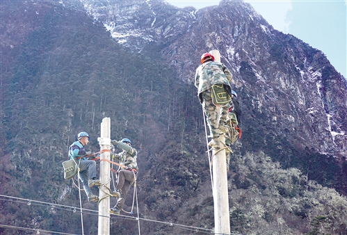 工人在玉麦乡境内施工。西藏自治区山南隆子县玉麦乡电力线路近日全线贯通,9户32位群众将用上国家电网源源不断的电能