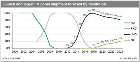 IHS分析师表示,由于UHD在超大尺寸电视显示器市场上的普及,面板制造商将会加大提供更高分辨率的差异化产品,进而利用高端产品提供利润率。