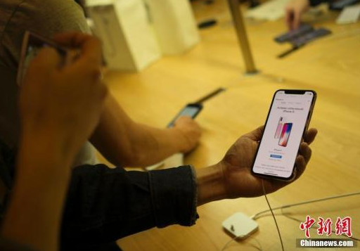 2017年11月3日,苹果iPhoneX在美国上市销售,位于纽约中央车站的苹果专卖店iPhoneX销售火爆。图为顾客体验iPhoneX手机。 中新社记者 廖攀 摄