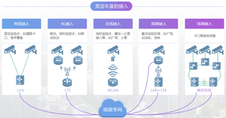 锐捷视频专网解决方案提供有线、无线、4G、有线+4G双网、环网等灵活的前端接入方式,针对不同场景,提供不同接入方案,构建全域覆盖的视频监控网络。