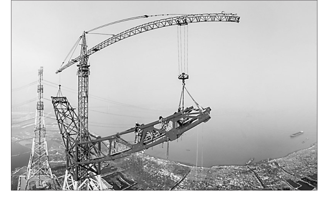 2月6日,在安徽省繁昌县荻港镇,跨越塔在进行横担就位施工(无人机航拍,拼接照片)。当日,世界上输电距离最长、输电量最大、电压等级最高的输电工程――昌吉―古泉±1100千伏特高压直流输电工程长江大跨越工程南岸跨越塔成功封顶
