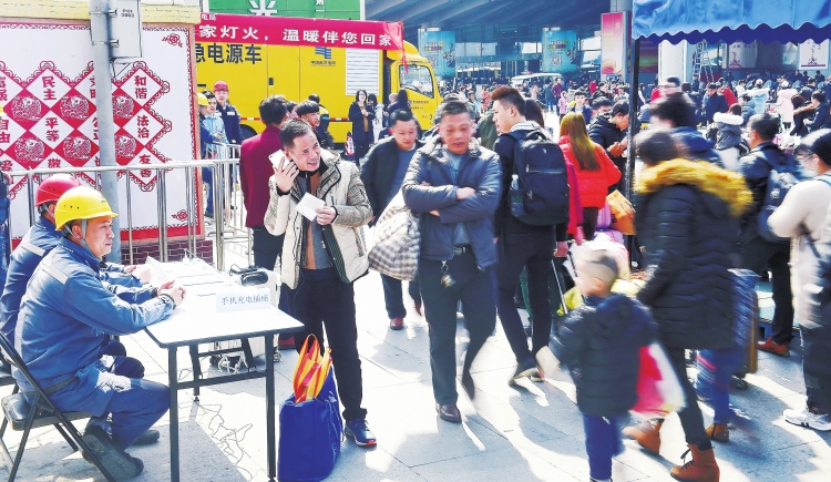 今年春运,广州南站日均发送客流量和停靠动车数量位居全国第一。为确保广州南站春运供电万无一失,广州供电局在该站设立临时指挥部,配备应急电源车,并对相关线路开展特巡特维。图为电网员工接通临时电源为返乡旅客提供手机充电服务。 (南网报记者 李志杰 通讯员 高剑辉 陈方静 摄)