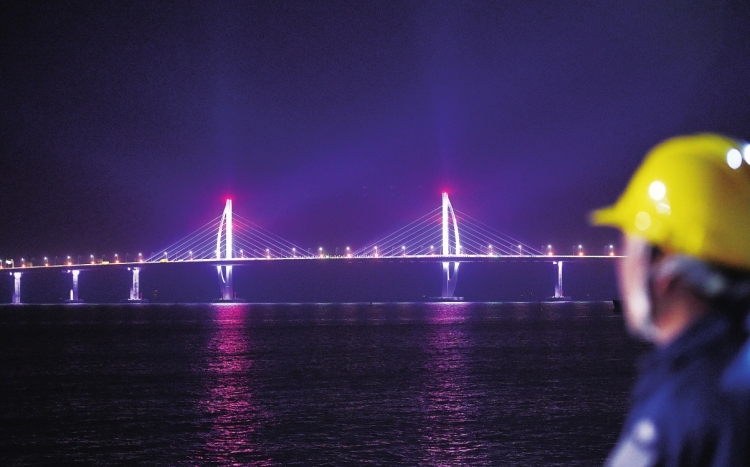 图为珠海供电局供电人员在港珠澳大桥人工岛巡视供电设备,为大桥提供稳定电力保障。