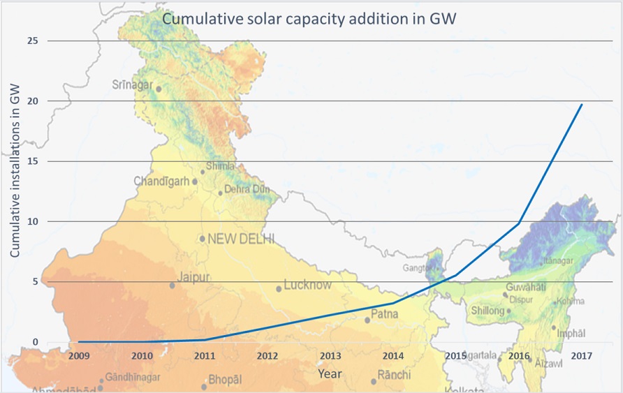 报告强调,截至2017年12月31日,印度的太阳能总装机容量达到19,516兆瓦,其中包括公用事业规模太阳能装机17,415兆瓦(89%)和屋顶太阳能装机容量2101兆瓦(11%)。与拉贾斯坦邦一起的四个南方州继续主导全国总装机容量,比2016年增长高达94%。