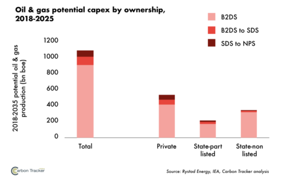 报告的另一个重要发现是,私人投资者的风险高于国有企业,其中88%用于不必要的石油和天然气项目。报告的作者解释说:“沿着每种化石燃料成本曲线的竞争定位范围意味着持有这些资源的公司之间在结果上存在很大差异。大多数石油和天然气储备可能由国有控股公司持有,但我们发现私人投资者对可能受到需求破坏影响的较高风险部分的暴露程度不成比例,如下所示。”