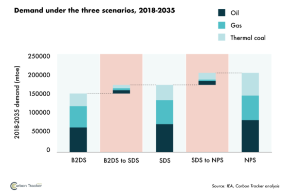 Carbon Tracker在报告中比较了三种主要矿物燃料:石油,天然气和煤在三个不同情景的资本投资,结果发现: