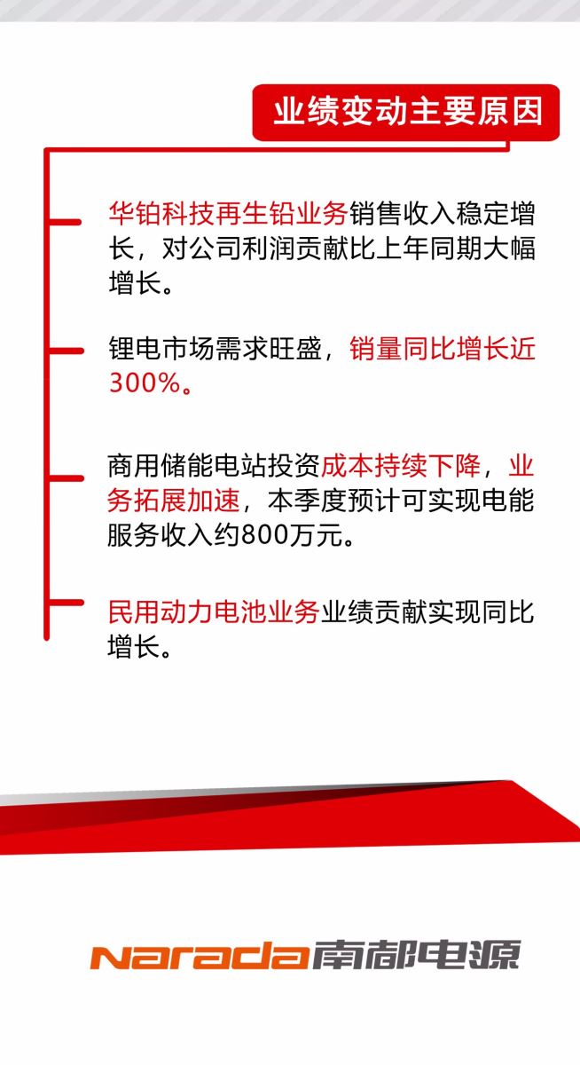 据分析,南都电源一季度业绩变动主要有四方面原因:1、华铂科技再生铅业务销售收入稳定增长,对公司利润贡献比上年同期大幅增长;2、锂电市场需求旺盛,销售同比增长近300%;3、商用储能电站投资成本持续下降,业务拓展加速,本季度预计可实施电能服务收入约800万元;4、民用动力电池业务业绩贡献实现同比增长。