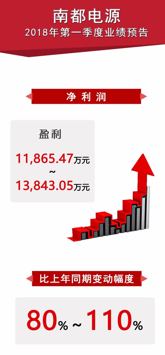 【电缆网讯】近日,南都电源发布2018年第一季度业绩预告显示,今年第一季度,公司实现净利润在11865.47万元-13843.05万元之间,同比增长80%-110%。