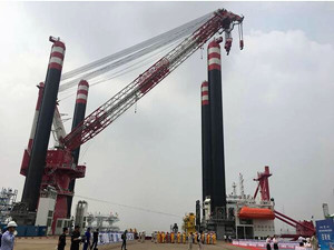 海上风电施工平台又称“海上风电安装船”,用来进行海上风机、基础运输及安装施工,平台拥有四条桩腿,牢牢地插入海底,将船体支撑并固定,形成不受波浪影响的稳定平台,是海上风电安装顺利进行施工的必备利器。此次交付的“龙源振华叁号”船长100.8米,宽43.2米,型深8.4米,是集大型设备吊装、打桩、安装于一体的多功能自升式海上风电施工平台。