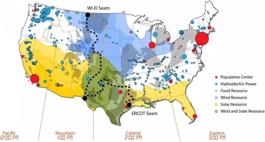将概念上的美国电力系统的主要区域拼接在一起,可以提高利用丰富的可再生资源和平衡全国各地负载的能力。(来源:NREL, 美国可再生能源国家实验室)