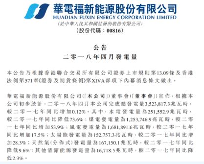 【电缆网讯】近日,华电福新发布公告显示,4月份,该公司完成总发电量352.38万兆瓦时,较2017年同比增加0.12%。其中,风电发电量为168.19万兆瓦时,较2017年同比增加17.5%;太阳能发电量为15.28万兆瓦时,较2017年同比增加28.3%;其他清洁能源发电量为16718.5兆瓦时,较2017年同比降低2.3%