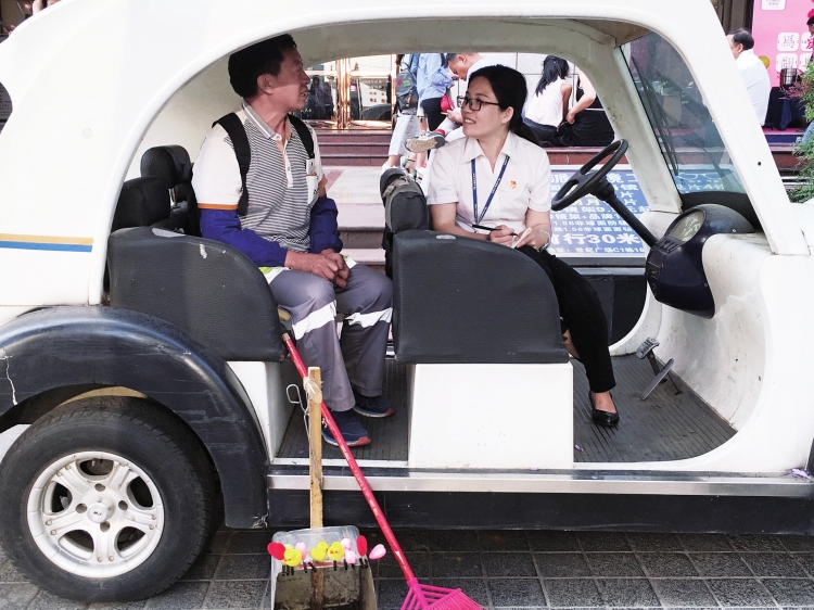 党员亮身份,虚心向保洁工人学习服务人民的工作作风。刘波摄 党员身份亮出来,责任真情传出去