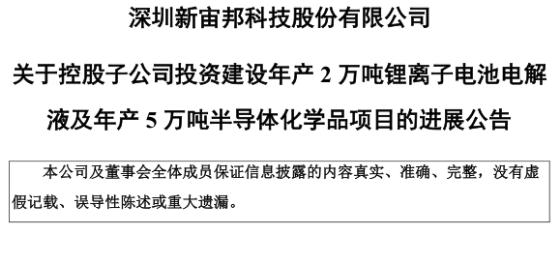 【电缆网讯】近日,新宙邦发布关于控股子公司投资建设年产2万吨锂离子电池电解液及年产5万吨半导体化学品项目的进展公告,公司同意以控股子公司荆门新宙邦为项目实施主体,项目实施地点在湖北荆门,预计投资3.5亿元,分两期建设。