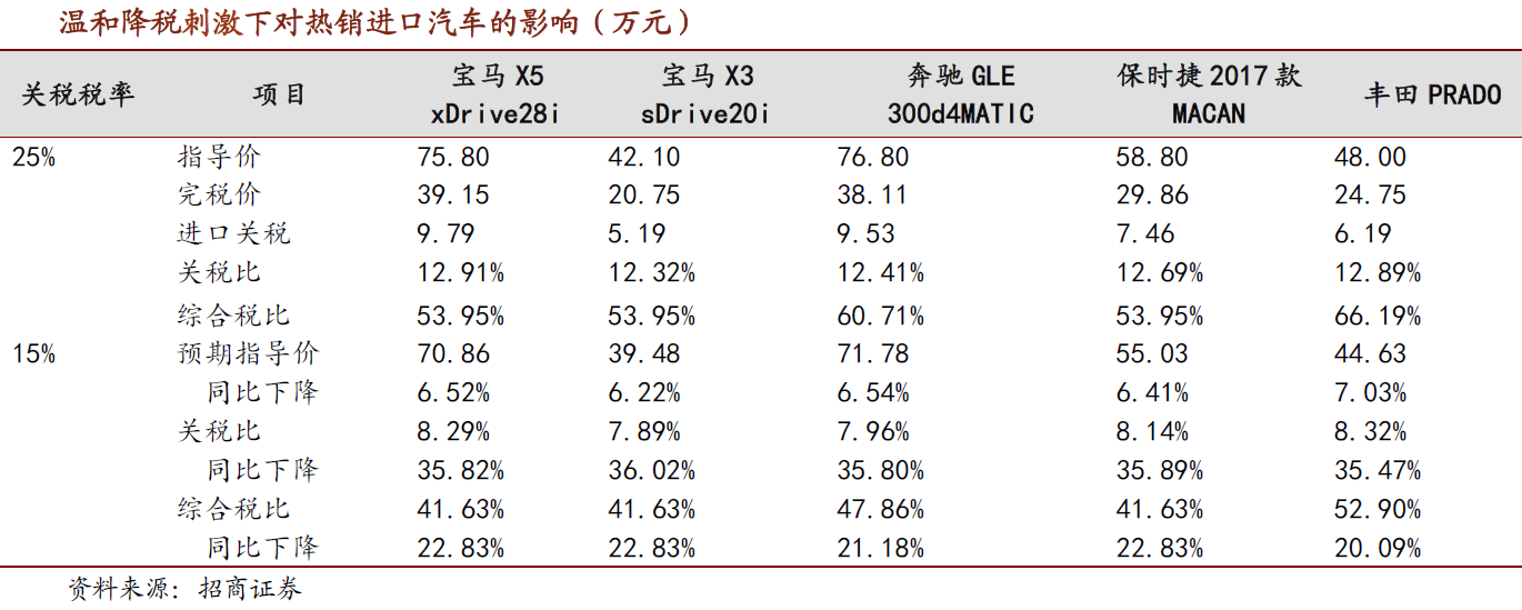 招商证券认为,从政策导向看,进口汽车关税下降能适度拉动进口汽车年销量的增加。据测算,关税降至15%,进口汽车厂商指导价降6%~7%,但实际中间环节会分享红利。博弈后实际降幅仍会低于测算,不会对现有价格体系造成实质压力。零部件关税下降降低部分国产汽车成本,提升部分中高端车型竞争力,考虑到中低端车型国产化率已经很高且降幅有限,因而对国内零部件行业冲击很小。