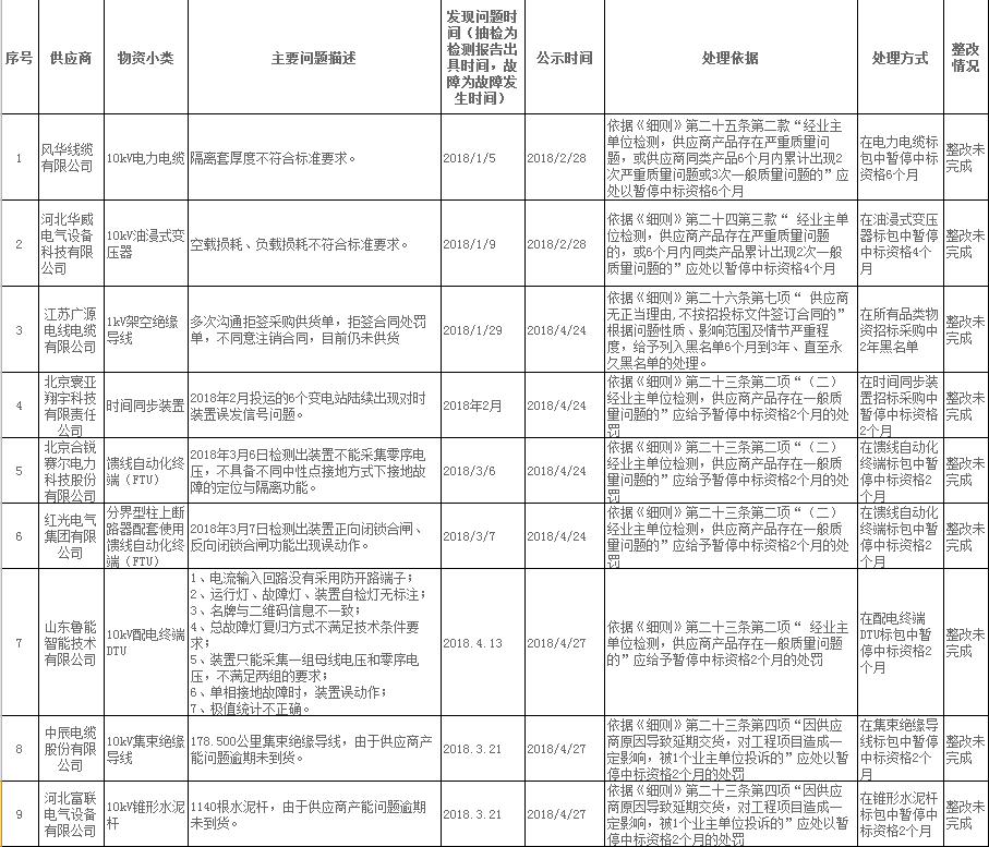 【电缆网讯】日前,国网北京市电力公司在国家电网公司电子商务平台发布了《关于供应商不良行为处理情况的通报(2018年5月)》,共对44家供应商的51起未完成整改的不良行为(有部分合并处理)进行了通报。