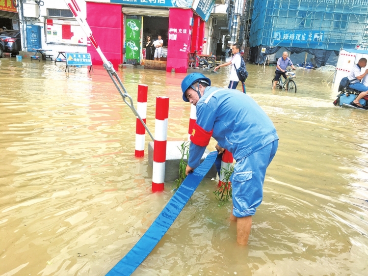 6月8日下午,广东电网公司党员突击队队员正在敷设抽水泵管,为被浸的公用配电站电房排水。 (郭伟 摄)