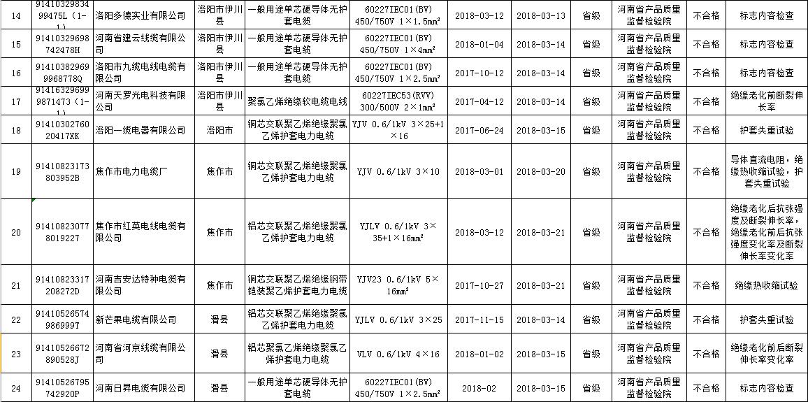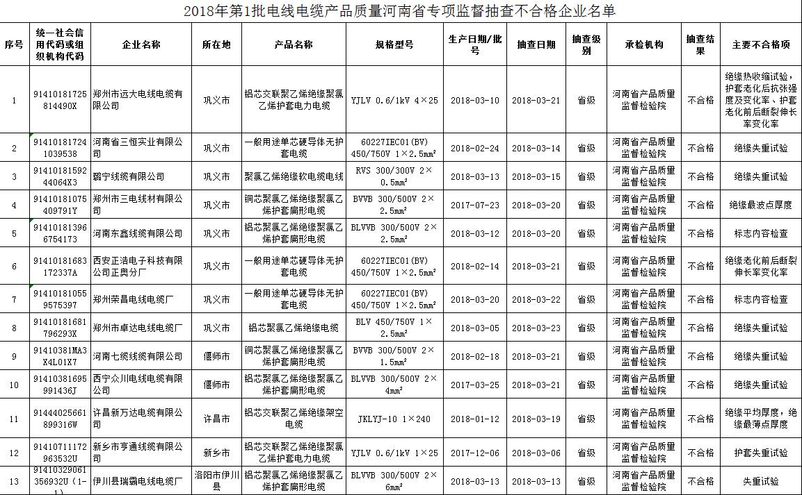 【电缆网讯】6月20日,河南省质量技术监督局发布了《关于2018年第1批电线电缆产品质量专项监督抽查情况的通报》。通报显示,河南省质监局从2018年2月起,组织开展了2018年第一批电线电缆产品质量专项监督抽查(豫质监监发〔2018〕38号)行动,期间共抽取了188家企业生产的220批次电线电缆产品