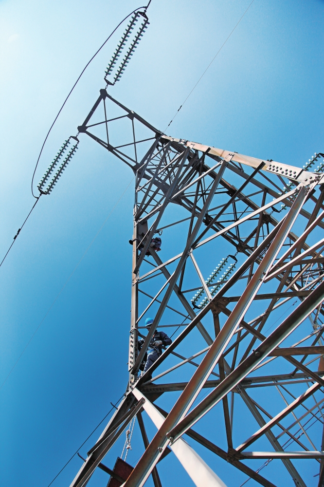 昆明供电局输电管理所工作人员正在攀爬铁塔,对线路缺陷进行处理。 曹春霞 摄