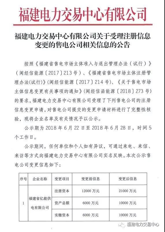 中国储能网讯:北极星售电网获悉,福建电力交易中心日前发布了《福建电力交易中心有限公司关于受理注册信息变更的售电公司相关信息的公告》,公示注册信息变更的福建省亿能供电有限公司1家售电公司,公示期为2018年6月22日至2018年6月28日,时间5个工作日。