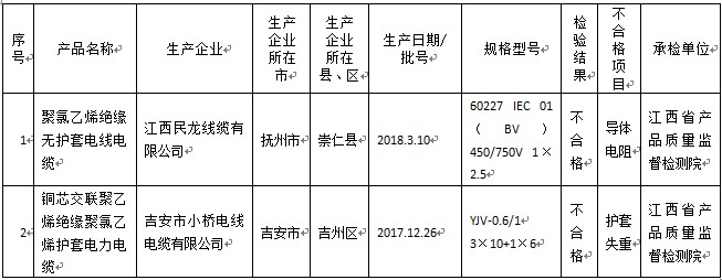 【电缆网讯】2018年江西省局组织对电线电缆产品开展了产品质量省级监督专项抽查。近日,江西省质量技术监督局通报2018年电线电缆产品质量省级监督专项抽查情况,检出2批次产品不合格,不合格产品检出率为2.5%。不合格企业为江西民龙线缆有限公司和吉安市小桥电线电缆有限公司,其中吉安市小桥电线电缆企业生产的产品连续2年抽查不合格。
