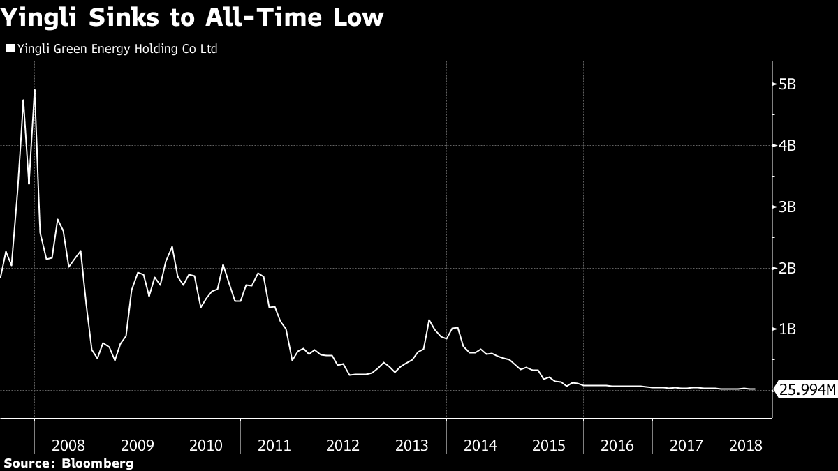 英利多年来一直在解体。该公司自2010年以来一直没有发布年度利润,是中国制造商浪潮中的一部分,这些制造商用低成本设备淹没市场,积极借贷扩张工厂。英利绿色能源的市场价值在2007年达到了近50亿美元的峰值,但由于太阳能电池板的价格下跌挤压了收入,因此债务累积。2014年,这家一度是全球顶级制造商的英利绿色能源开始走下神坛。