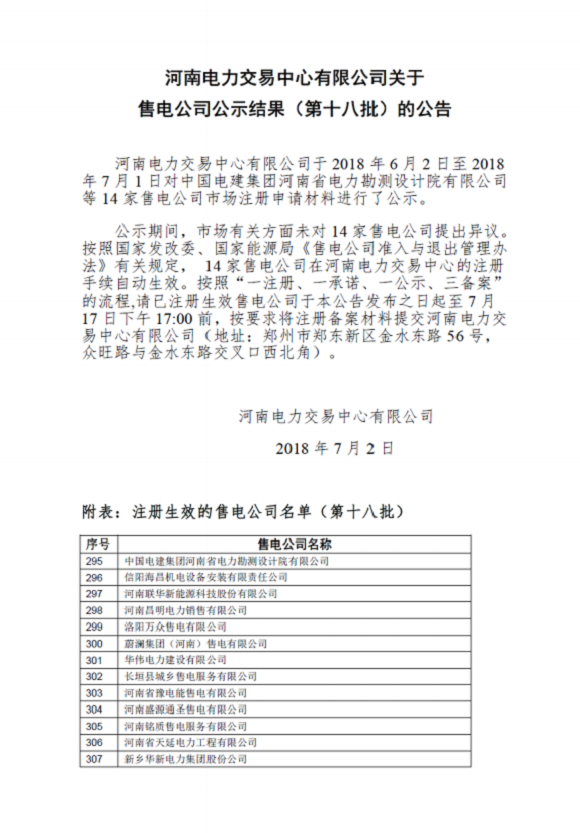 中国储能网讯:河南电力交易中心日前发布了《河南电力交易中心有限公司关于售电公司公示结果(第十八批)的公告》,中国电建集团河南省电力勘测设计院有限公司等14家售电公司在河南电力交易中心的注册手续自动生效。 详情如下: