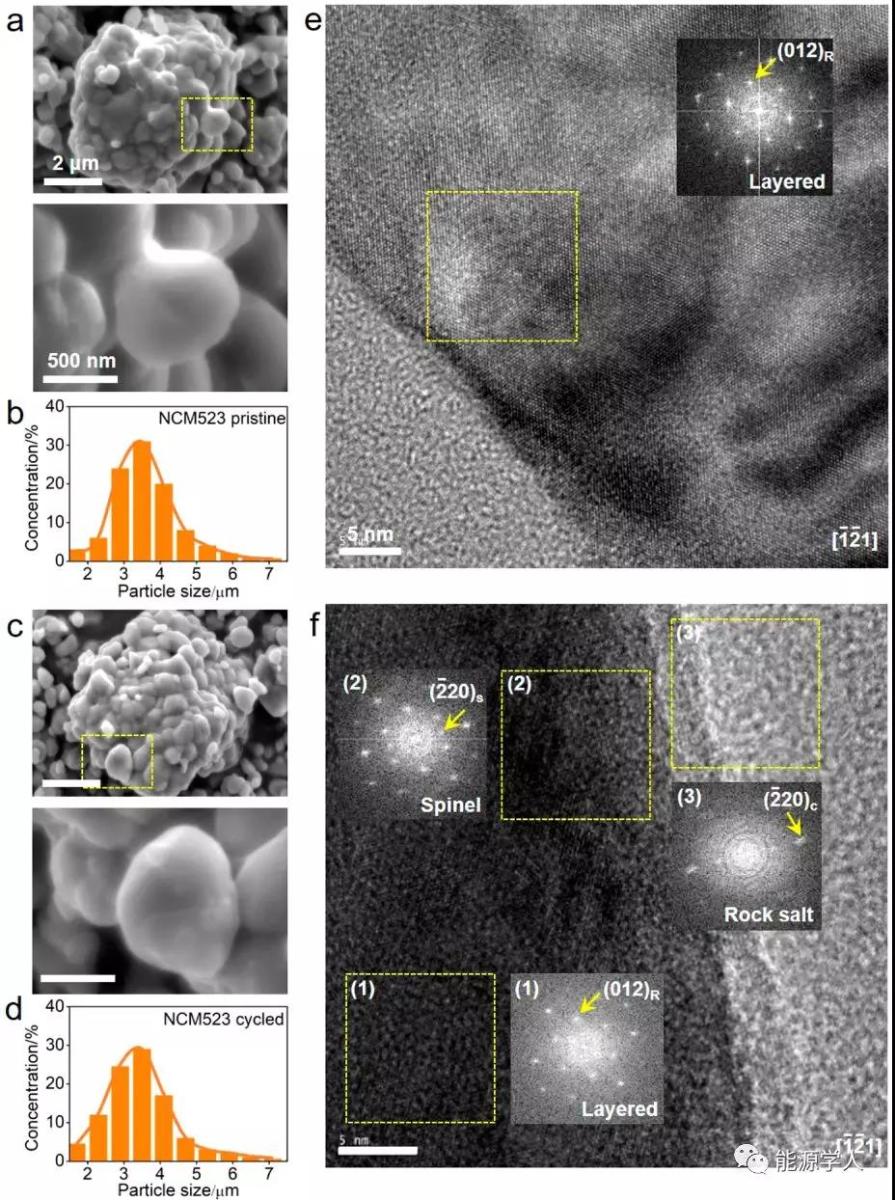 图1. (a) 原始NCM523颗粒的SEM图像,(b) 原始NCM523二次颗粒的尺寸分布,(c) 循环后NCM523颗粒的SEM图像,(d) 循环后NCM523 二次颗粒的尺寸分布,(e) 原始NCM523颗粒的HR-TEM图像,(f) 循环后NCM523颗粒的HR-TEM图像。