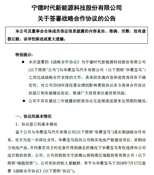 【电缆网讯】7月17日午间,宁德时代发布公告称,鉴于公司与华晨宝马是长期战略合作关系,双方为进一步深化合作,华晨宝马拟向公司购买电池产能建设项目,采购动力电池产品,并同意在双方约定条件得到满足的情况下华晨宝马有权选择向公司进行股权投资。公司与华晨宝马于2018年7月17日签署《战略合作协议》