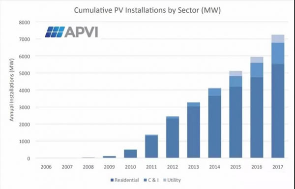 2018年上半年,小于100KW的光伏装机量已经达到了700MW,这一数字不仅超过了2016年全年的安装量,和2017年同期相比,也增长了50%。澳大利亚光伏研究所主席Egan预计今年小于100KW的项目装机量将超过1.5GW。