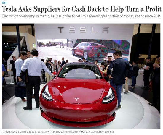 华尔街日 报援引电动汽车制造商特斯拉公司上周发给供应商的备忘录报道,为了实现盈利,特斯拉要求一些供应商退还部分货款。