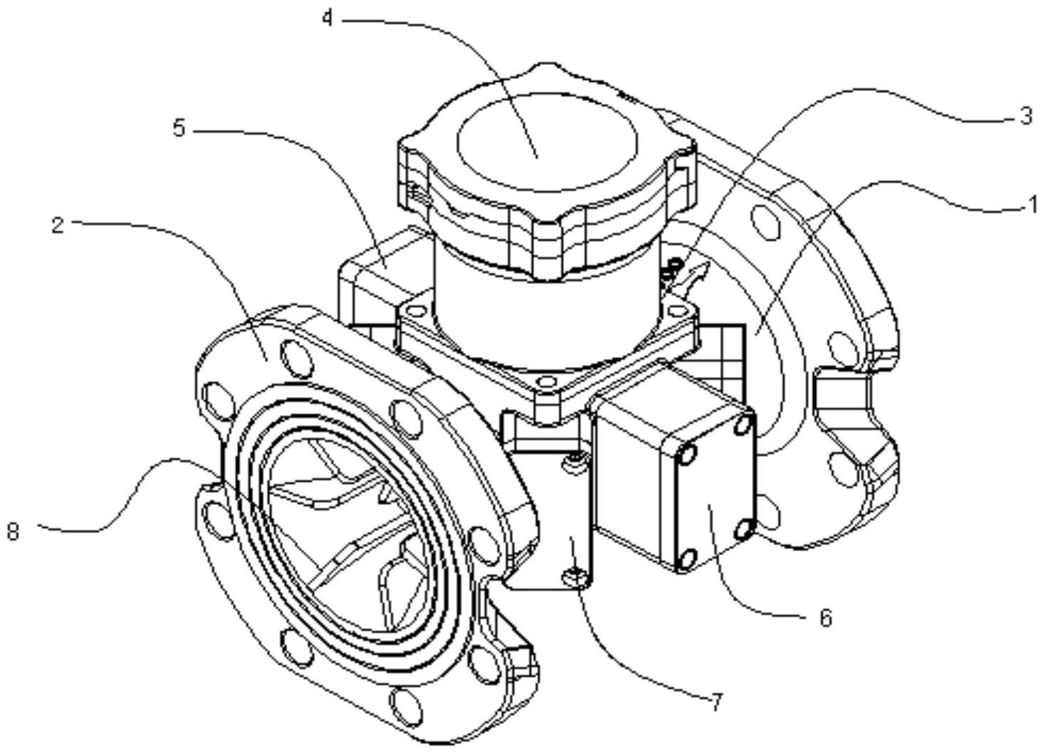 在电路安装腔的通信模块安装面上设置有通信电路通孔,在电路安装腔的压力模块安装面上设置有压力信号电路通孔和压力探测水流通孔,在电路安装腔的超声波模块安装面上还分别设置有超声波探头安装孔,所述通信电路通孔和所述压力信号电路通孔与所述电路安装腔的腔室相通,所述压力探测水流通孔和所述超声波探头安装孔与所述流量管相通。
