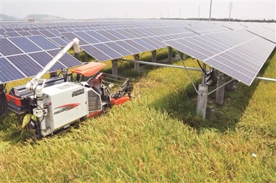 昨天,记者在基地看到,今年年初种下的300亩早稻已经成熟,饱满的稻穗随着微风沙沙作响,而收割机正在田地里飞快地收割,田间地头上方是一排排整齐的太阳能面板,正在将阳光变成源源不断的电源。