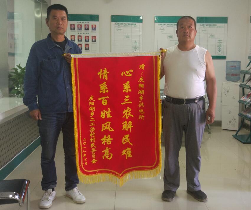 7月22日下午,吉木萨尔县庆阳湖乡二工梁村村民委员会向国网吉木萨尔县供电公司庆阳湖供电所赠送一面印有“心系三农解民难、情系百姓风格高”的锦旗,对该公司认真负责、优质高效的用电服务表示诚挚感谢! “是庆阳湖供电所吗?我们机井的低压配电箱出问题了,现在这么晚,我们实在找不到人处理,村民急着抽水浇地,麻烦你们过来帮忙看一下吧”。7月21日凌晨2时,该公司庆阳湖供电所值班人员接到客户报修电话