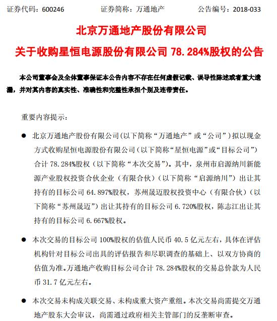 【电缆网讯】7月30日,万通地产发布公告,拟31.7亿元收购星恒电源股份有限公司78.284%股权,涉足锰酸锂动力电池、新能源汽车产业。