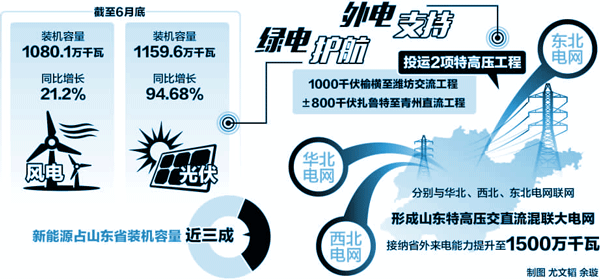 据统计,截至6月底,山东电网风电装机容量1080.1万千瓦,光伏电站容量1159.6万千瓦,分别同比增长21.2%和94.68%,新能源占全省装机容量近三成,光伏的装机容量首次超过风电,成为新能源发电的主力,为迎峰度夏助一臂之力。“针对光伏、风电季节性特点,我们将加强新能源出力智能预测,优先安排风电和光伏发电,保证绿色电力全额上网。”马杰说。
