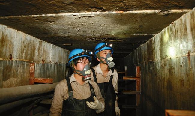 国网陕西省电力公司员工来到发生内涝的电缆沟内排除积水、检修设备,电缆沟温度超过40摄氏度。