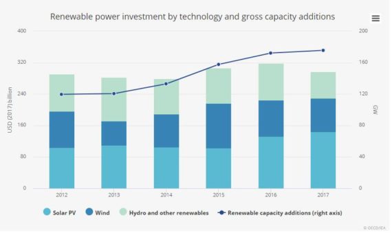 相比之下,IEA称2017年“可再生能源”达到“近3000亿美元”,并参考了太阳能光伏,海上和陆上风电以及水电的开支。2015年,国际能源署提到“可再生能源投资,主要是风能,太阳能光伏和水电”达到“近2900亿美元”,并在2016年“投资新的可再生能源电力产能达2970亿美元”。
