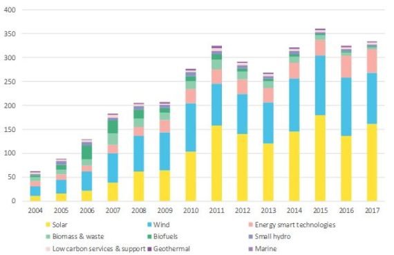 彭博社将其数字定为3335亿美元,是基于“其世界领先的项目和交易数据库”,其重点是“全球可再生能源和能源智能技术投资。”在过去几年中,这一数字甚至在2015年达到3603亿美元的历史纪录,2016年为3,126亿美元,2017年为3,335亿美元。
