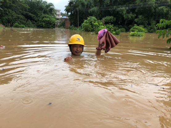 8月12日,南方电网广东云浮郁南供电局大湾供电所抢修人员途经水浸严重、车子无法前行的地方,只身涉水赶往抢修点,最深处水深已接近1.5米。(张伟斌 摄)