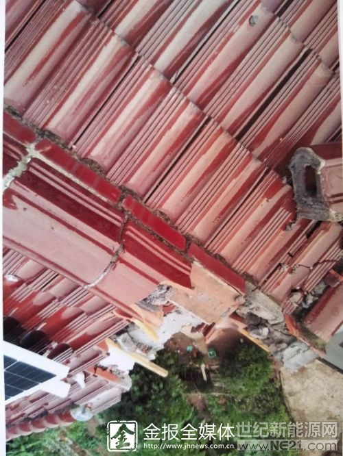 但很快,吴女士一家的好心情就被“天公”给“没收”了。7月27日下午2点左右,东阳忽然乌云滚滚、狂风四起。眼看着要下雨,吴女士的母亲就上楼准备关窗户。她上楼还没几分钟,头顶突然炸来了一声的雷暴声,屋顶的瓦片纷纷掉落下来。她往上一看,屋顶已被雷击出了一个大窟窿。吴女士一家赶紧上楼顶查看,发现屋顶的一角已破损严重,光伏板也有部分损坏。