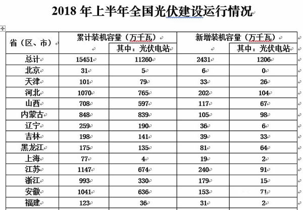 数据还显示,截至2018年6月30日,北京市光伏发电累计装机量为31万千瓦,光伏电站装机为5万千瓦,新增光伏装机量6万千瓦,光伏电站一栏显示为零,表明北京今年上半年光伏新增装机均为分布式项目。