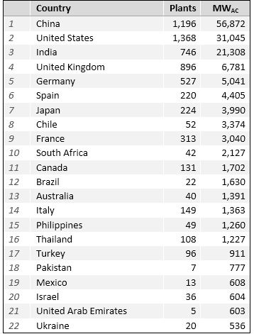 总体而言,太阳能园区的累计容量已达到约160吉瓦,其中大部分部署在中国(56.8吉瓦),美国(31.0吉瓦),印度(21.3吉瓦),英国(6.7吉瓦)和德国(5吉瓦)。