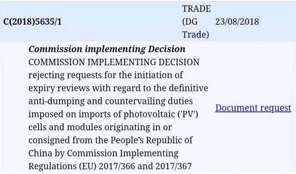 日前,根据中国机电商会的消息,欧委会已经正式拒绝了欧盟光伏双反调查申请人EU ProSun关于发起日落复审的申请,目前的MIP措施和双反税将在2018年9月3日到期以后取消,恢复自由贸易。正式的公告已经在欧盟内部排期,预计会在9月3日之前公布
