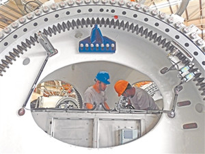 【电缆网讯】8月27日,江苏省连云港市开发区一风电设备制造企业在安装风电轮毂。据了解,连云港市开发区已成为亚洲最大风电设备生产基地