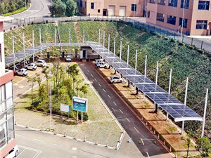 在该直流快充示范站可以看到,一个呈“V”字形的车棚,顶部使用的材料与众不同。车棚内安装有15台直流快速充电桩,每台电桩有两把充电“枪”。角落上有一个1MW˙h储能、充电和放电一体化集装箱,箱内整合了储能电池组、光伏控制系统和充电桩控制系统。路边立起的LED大屏幕上,可以实时看到光伏发电的累计发电量、每把充电“枪”的累计充电量、节省标煤用量和二氧化碳排放、噪音监测音量等信息。