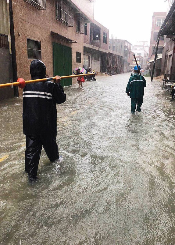 南方电网广东汕头供电局工作人员第一时间进入水浸严重地段,逐一排查设备隐患。
