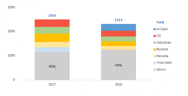 比对1H17与1H18从中国出口到日本的光伏组件量可发现,1H17中国对日出货量为2,503MW,出货量最多的是日本京瓷;但在1H18,京瓷已被中国厂商挤到第4名,第一名宝座由晶澳太阳能夺下。此外,比对JPEA所公布的出货数据,1H17日本市场共出货3,132MW,1H18则出货2,592MW,明显可见中国制光伏组件的市占率往上提升。