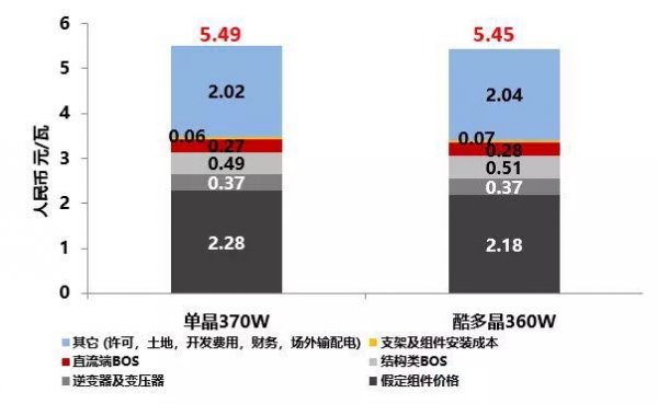 下表中,我们对比了两种组件类型的系统成本,包含组件、逆变器、汇流箱、支架、线缆、土地、人工等成本。从下表可以看出单晶370瓦的系统成本是5.49元/瓦,酷多晶360瓦的系统成本5.45元/瓦,酷多晶的成本更低。