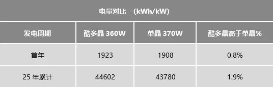 2、25年发电周期内,酷多晶系统发电量比单晶系统多1.9%。使用酷多晶组件,项目投资回报率更高。
