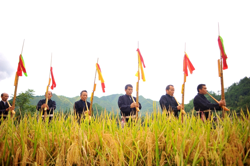 苗族同胞吹芦笙、跳芦笙舞,喜迎首届中国农民丰收节。